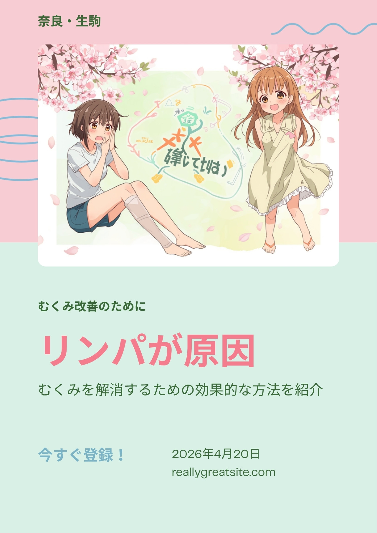 奈良・生駒市の整体院「若-waka-」では、リンパケアに特化した施術で春のむくみ・だるさ・疲労感をサポートしています。生駒 むくみ・東生駒 整体でお悩みの方は、ぜひ一度ご相談ください。体を内側から軽くして、毎日を快適に過ごしましょう。